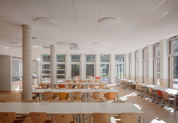 Der Freizeitbereich erstreckt sich über die gesamte Breite des Ostflügels. Bewegliche Farbflächen vor den Fenstern setzen leuchtende Akzente.